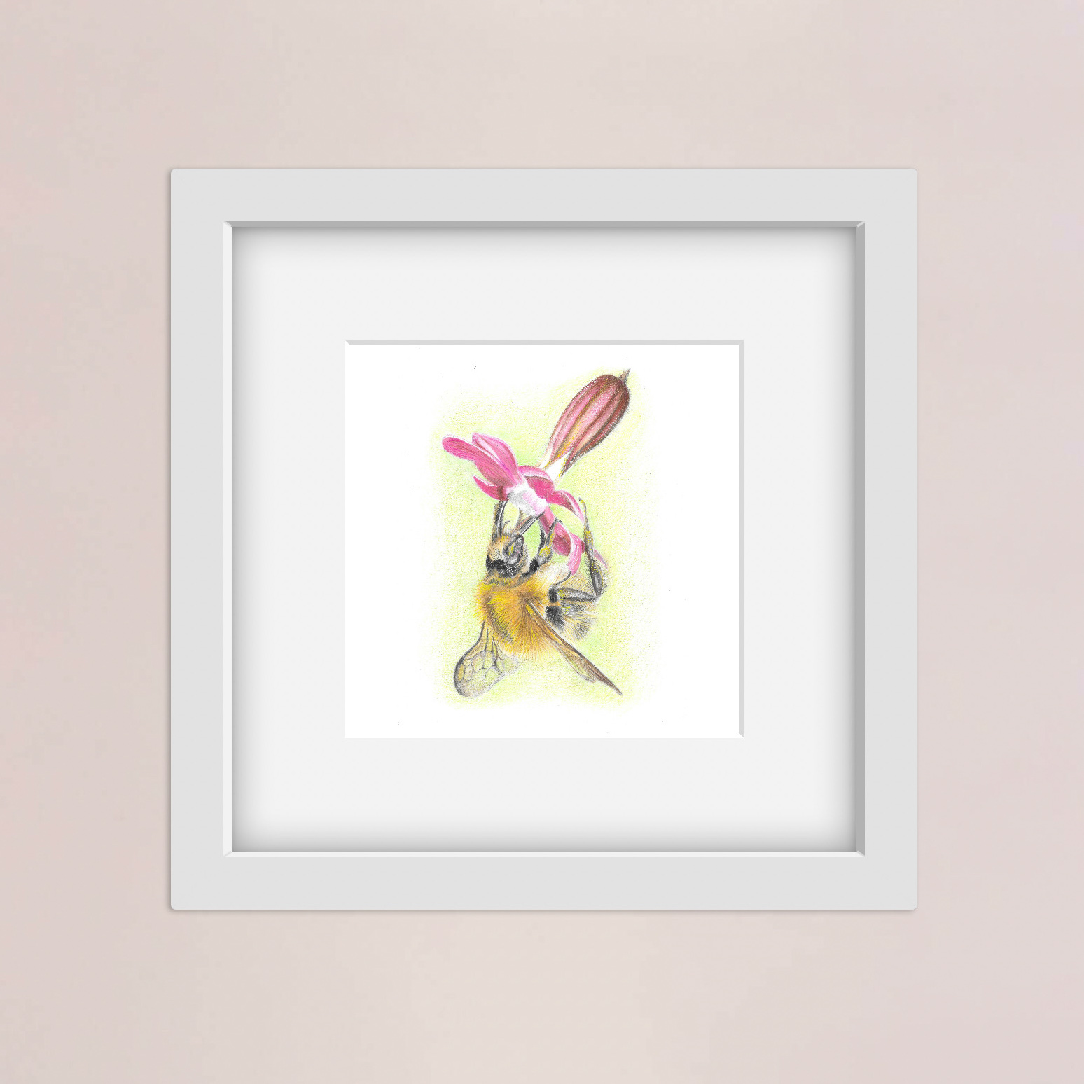 Bumblebee on flower square colour pencil mounted bee illustration.