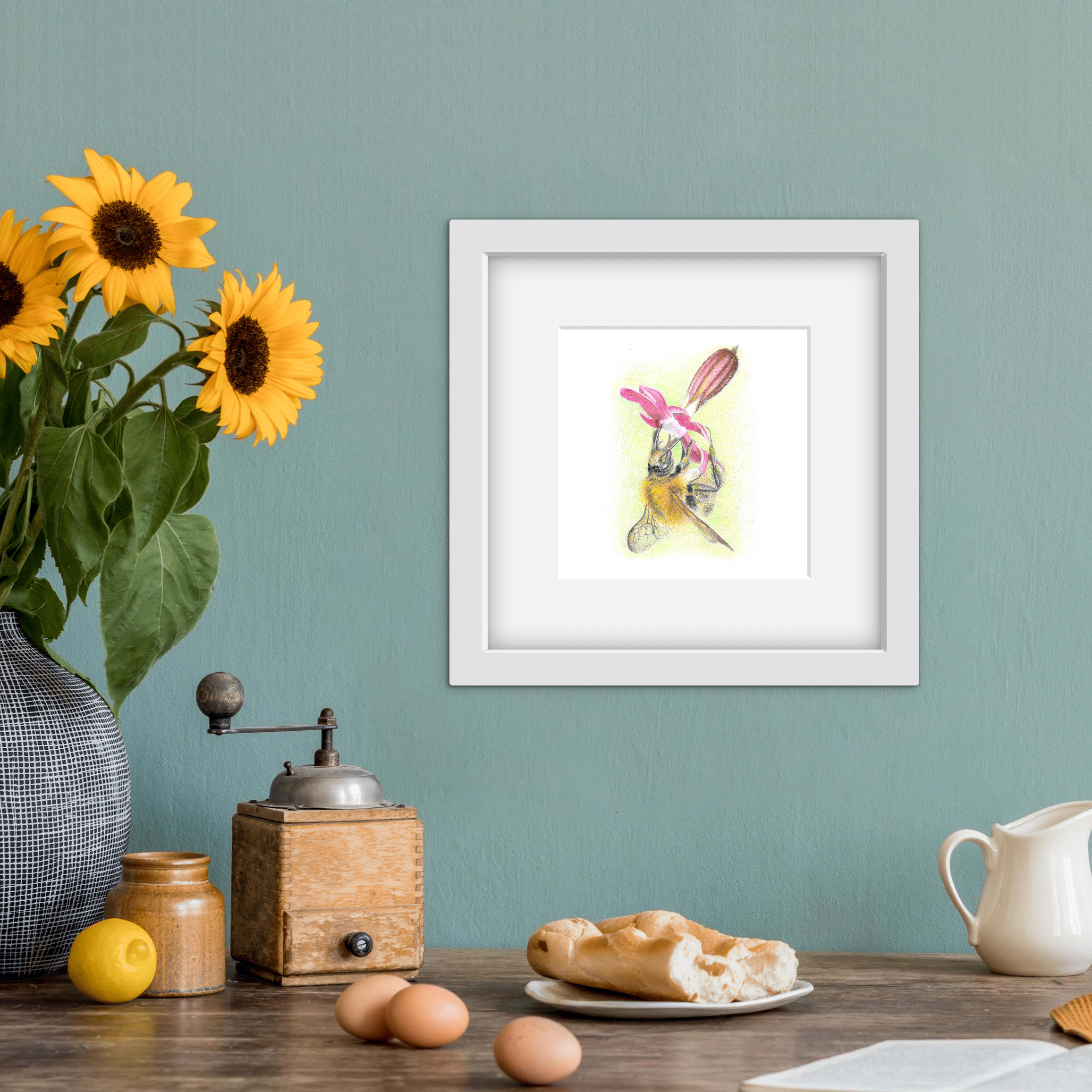 Bumblebee square print. Colour pencil bird illustration in white mount.