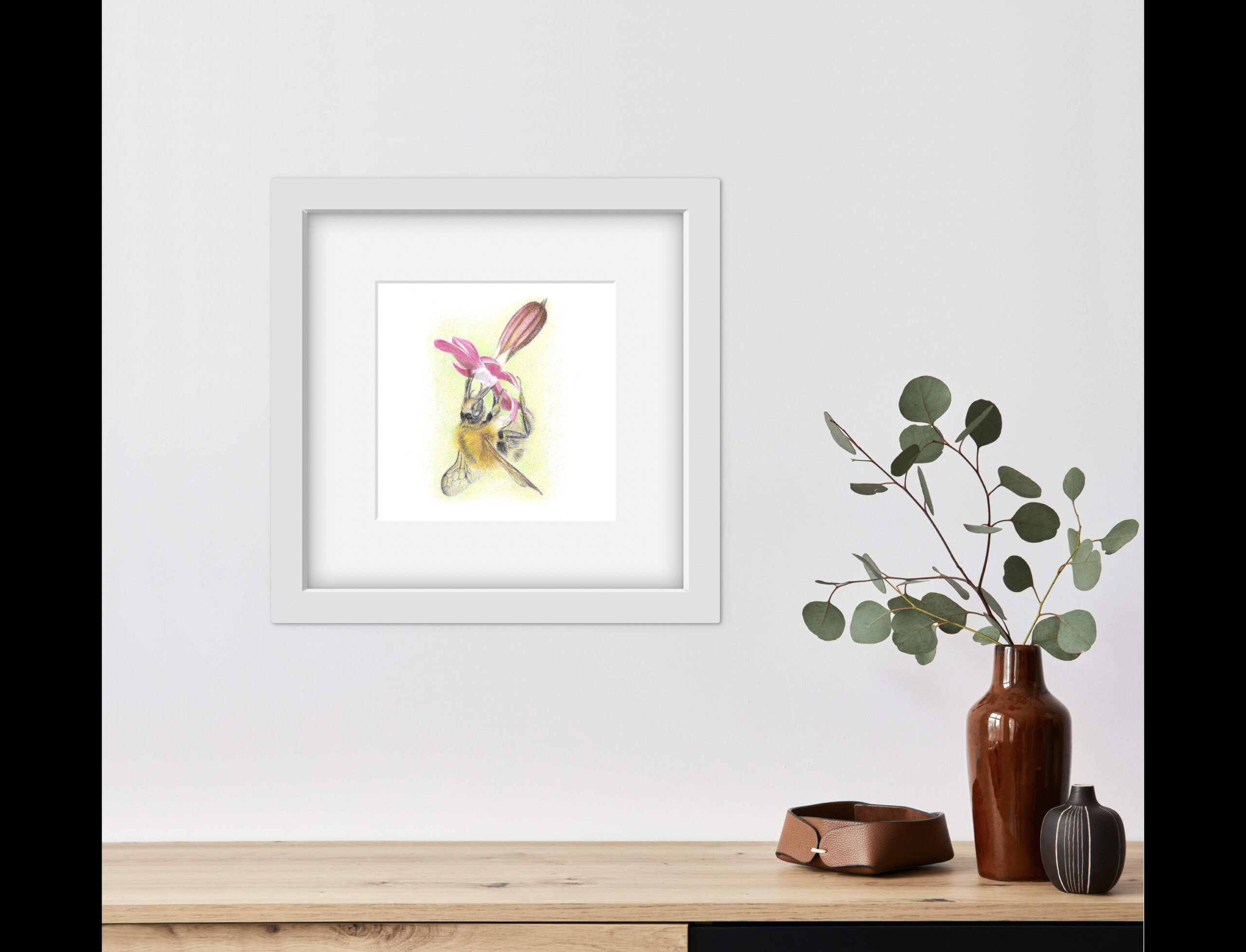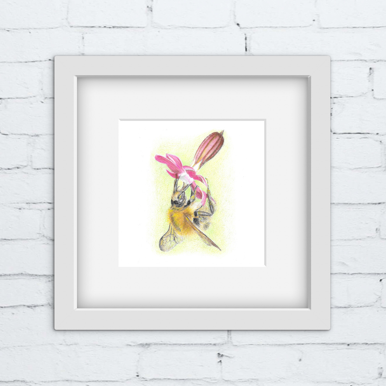 A print from my hand drawn, colour pencil bee illustration. The original drawing was inspired by a photograph that I took during a Cornish Spring. You can see the original photograph in the listing images.